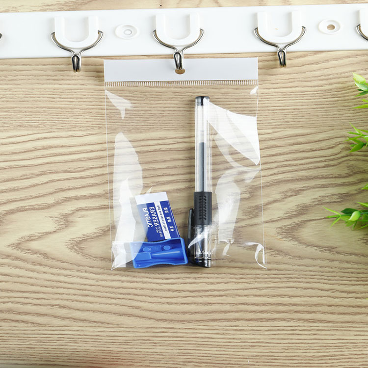 Is é méid Mála Cárta Ceann OPP ná 2.8*18cm, 5*15cm, 5*24cm, 6*8cm, 6*12cm, 6*15cm, 6*28cm. Glacaimid méideanna saincheaptha freisin. Tá ceannchárta ag ár málaí opp déanta as scannán péarla ar a bharr le poll le haghaidh crochta. Tá an comhlacht mála thar a bheith trédhearcach. Ag deireadh an mhála, tá flap le stiall greamaitheach chun na málaí a shéaladh tar éis míreanna a phacáil. Tairgeann ár monarcha sampla atá ann cheana féin saor in aisce más mian leat an caighdeán a sheiceáil ar dtús sula gceannaítear mórchóir málaí opp . (lasta réamhíoctha nó bailiú lasta)